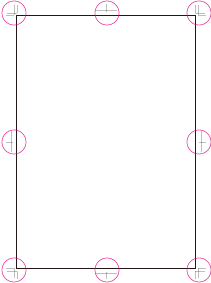 「トンボ(トリムマーク)」とは、印刷するデザインの四隅と、各辺の中心につける印のことです。印刷物を仕上がりサイズに断裁する際、版を重ね合わせるために必要な印になります。一例として、下記画像の外側の赤丸部分のことを「トンボ(トリムマーク)」になります。