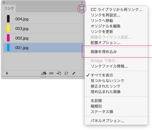 メニュー「ウィンドウ」→「リンク」 - 「画像を埋め込み」を選択