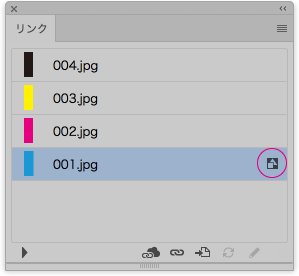 正しく埋め込みがされると、リンクパレット内のファイル名の横に下記のマークが表示されます。このマークが埋め込みのマークになります。