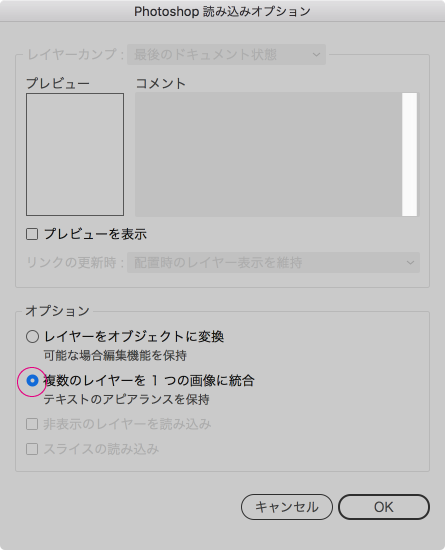 透明を含んだPhotoshop画像を埋め込むと、次のような「Photoshop読み込みオプション」が表示されます。必ず「複数のレイヤーを1つの画像に統合」を選択して下さい。
