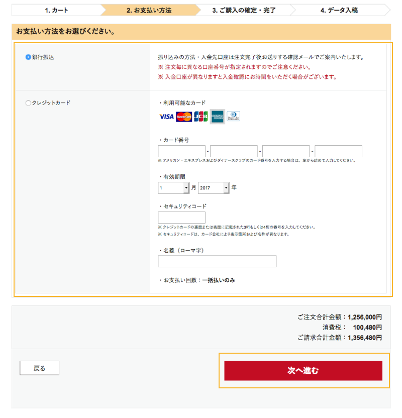 クレジットカードを選択の場合は、必要事項を入力後「次へ進む」ボタンをクリックします。