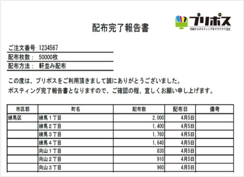 ポスティングが完了しましたら、「ポスティング完了のお知らせ」メールを送信いたします。あわせて「配布日」・「配布エリア」・「配布枚数」をまとめた報告書を送付いたします。報告書は、マイページ > 注文詳細 > ダウンロード(PDFファイル)からご確認頂けます。