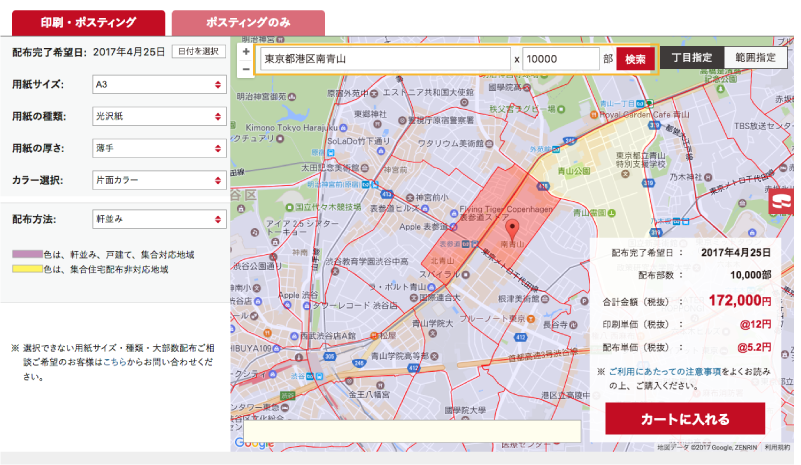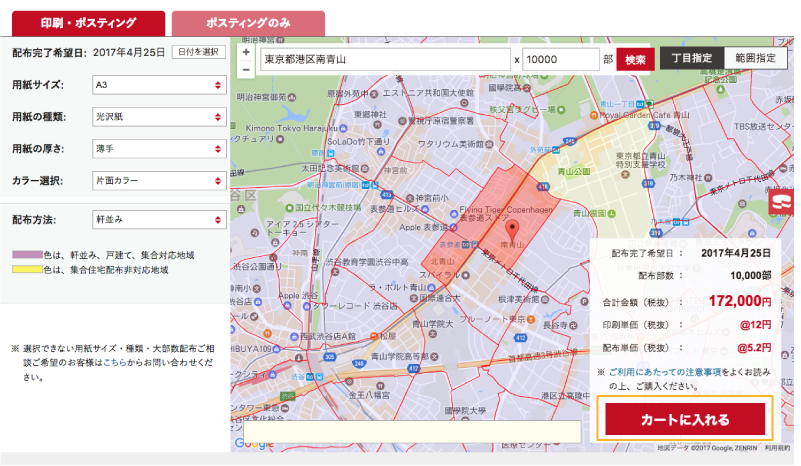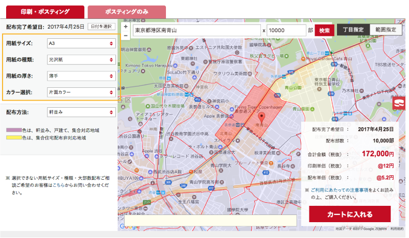 ご希望条件の入力・選択が終わりましたら、「配布完了希望日」・「配布部数」・「合計金額」を確認し、「カートに入れる」をクリックします。