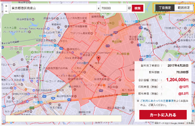 地図上から「丁目指定」、もしくは「範囲指定」にて配布エリアを選択します。
