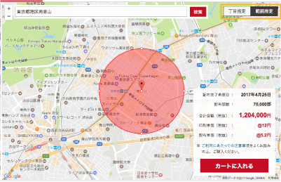 範囲指定につきましては、はじめに検索ボックスに中心点となる住所を入力してください。続いて、右側の詳細指定欄の、「半径で指定」・「部数で指定」・「予算で指定」のいずれかにご希望条件を指定すると、自動的にエリアが選定されます。