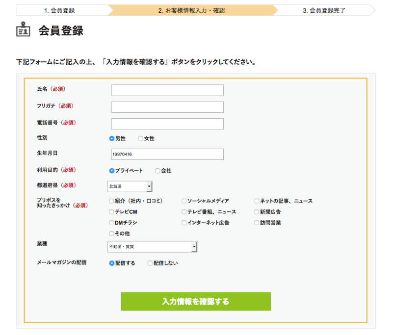 - 続いて、会員登録に必要な基本情報を入力します。「入力情報を確認する」ボタンを押すと、ご登録いただいたメールアドレス宛に「会員登録完了のお知らせ」メールが送信されます。